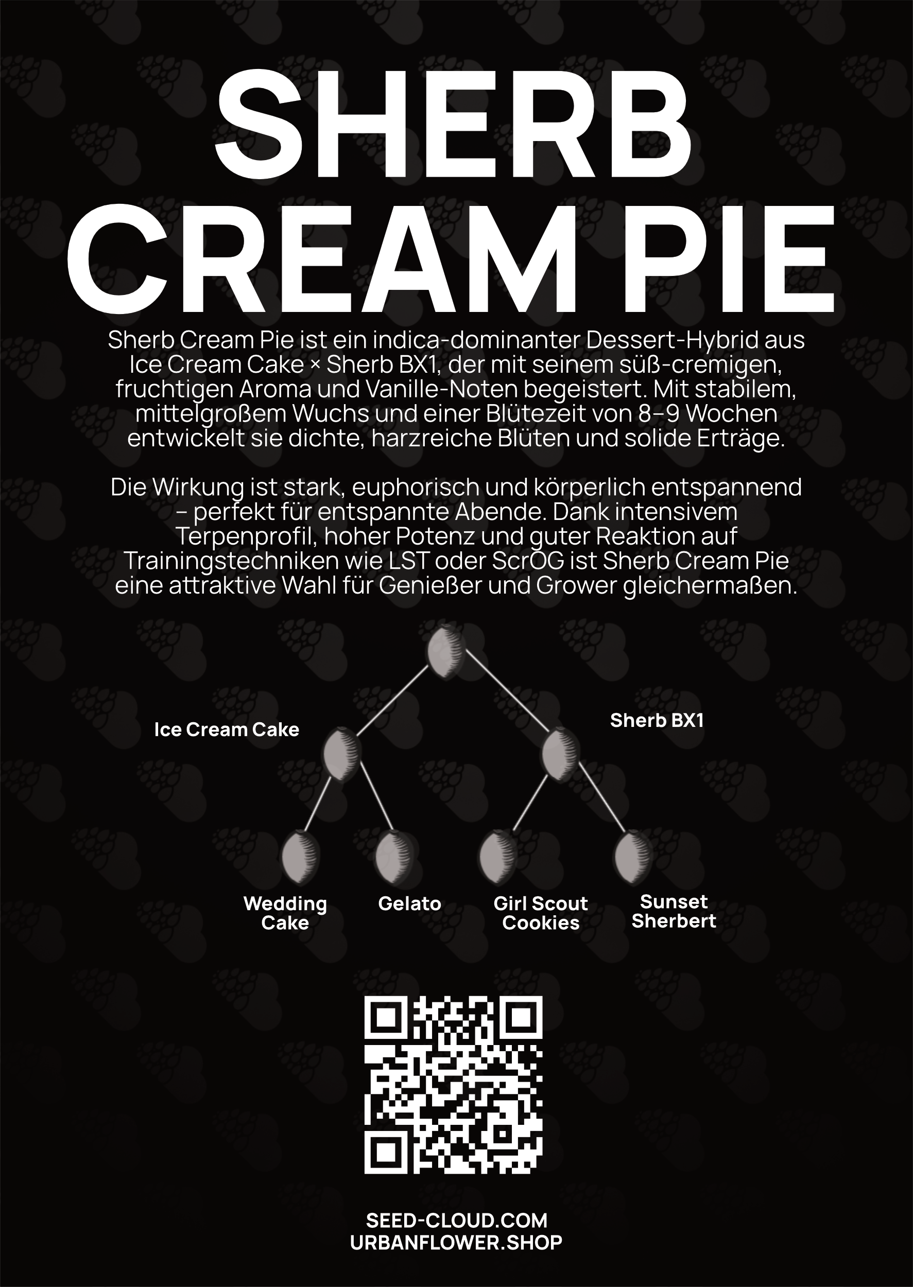 Sherb Cream Pie ist ein indica-dominanter Dessert-Hybrid aus Ice Cream Cake × Sherb BX1, der mit seinem süß-cremigen, fruchtigen Aroma und Vanille-Noten begeistert. Mit stabilem, mittelgroßem Wuchs und einer Blütezeit von 8–9 Wochen entwickelt sie dichte, harzreiche Blüten und solide Erträge. Die Wirkung ist stark, euphorisch und körperlich entspannend – perfekt für entspannte Abende. Dank intensivem Terpenprofil, hoher Potenz und guter Reaktion auf Trainingstechniken wie LST oder ScrOG ist Sherb Cream Pie eine attraktive Wahl für Genießer und Grower gleichermaßen.